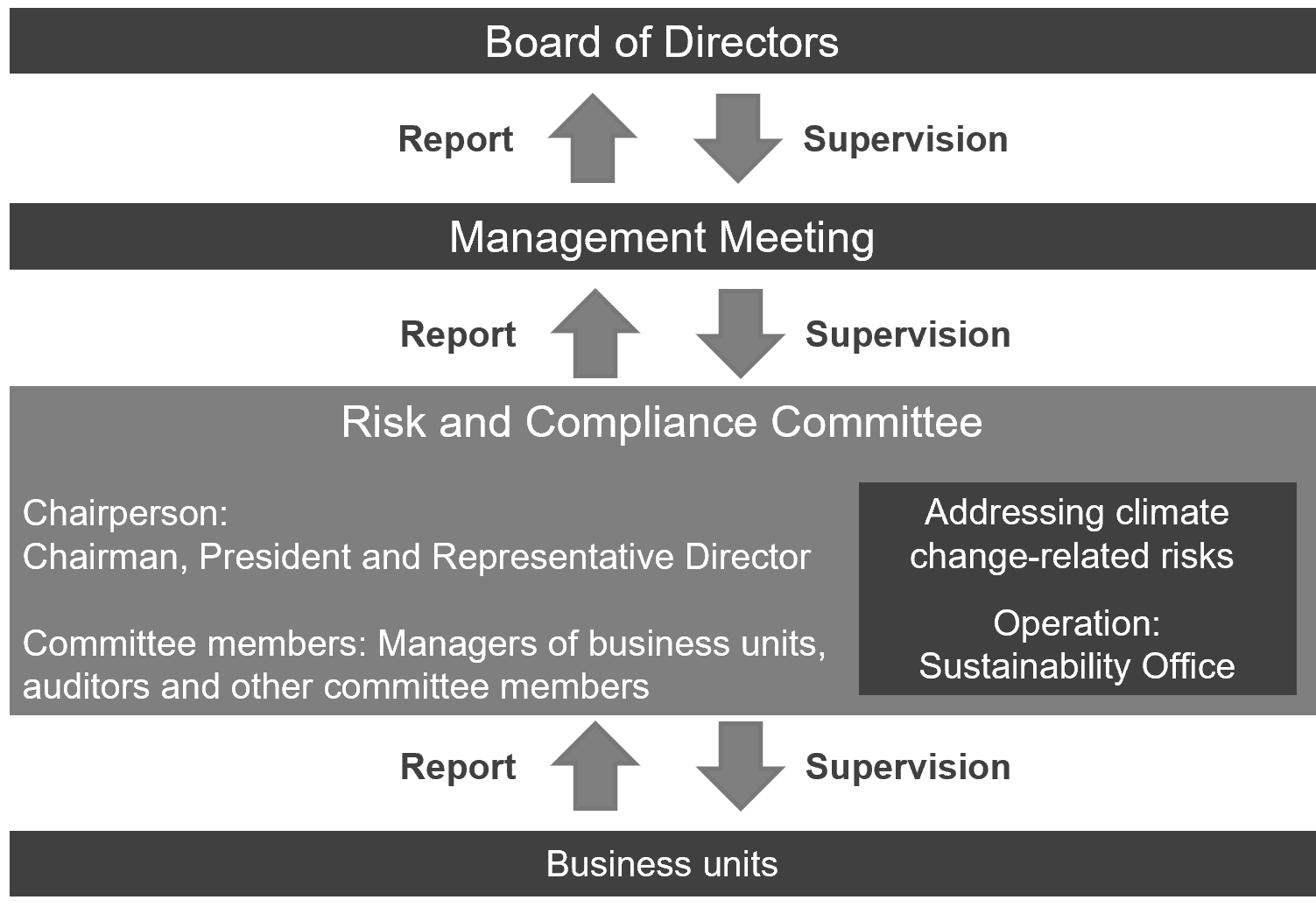 We established Risk and Compliance Regulations and the Risk and Compliance Committee to, in compliance with the COSO ERM framework, build a system for preventing, detecting, correcting and managing all risks that may arise in business operations including risks relating to climate change, and to decide how to handle the risks that do arise. The Committee is chaired by the company's Chairman who is also the President and Representative Director and its members include managers of business units, Directors and Audit and Supervisory Committee Members and others. Subordinate to the Risk and Compliance Committee, the Sustainability Secretariat Office identifies and assesses new risks accompanying climate change and specifies important risks considering their impact on the management of business, finances, operations and other matters.