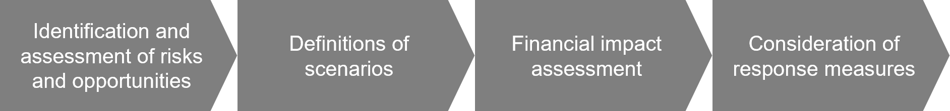 The company evaluates the importance of specified climate change-related risks in terms of the possibility of their occurrence and their impact. The Risk and Compliance Committee discusses and decides how to reduce the risks that are regarded as important. This is followed by discussion at Management Meetings before they are reported to the Board of Directors. The Board of Directors discusses the reported climate change-related risks. The policies of action that are determined are communicated via the Risk and Compliance Committee to the concerned divisions and their actions are monitored.